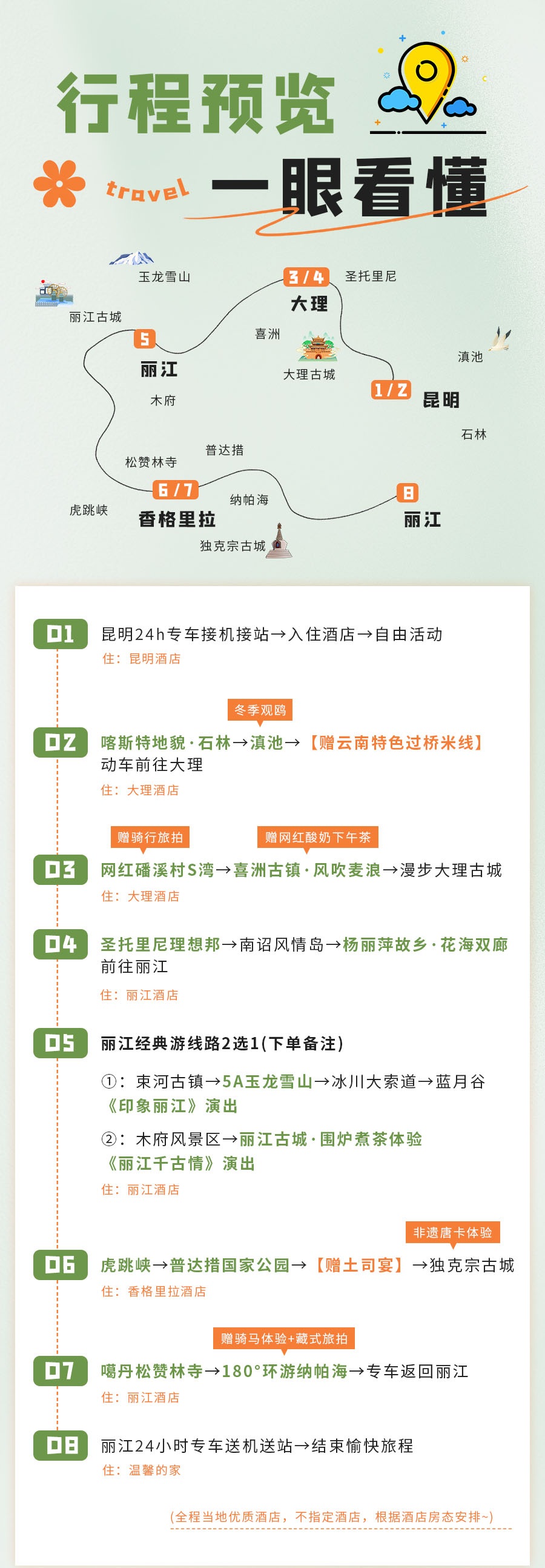 住宿:丽江金林豪生大酒店(古城区店)或丽江复华丽朗度假村或丽江国际大酒店(丽江古城大水车店) 💡温馨提示: